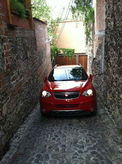 If we need to go to the super mercardo or go out of town we must first drive up a small street. Please note the position of the mirrors. A lot of wincing and moaning goes on and it isn’t the pleasurable kind.